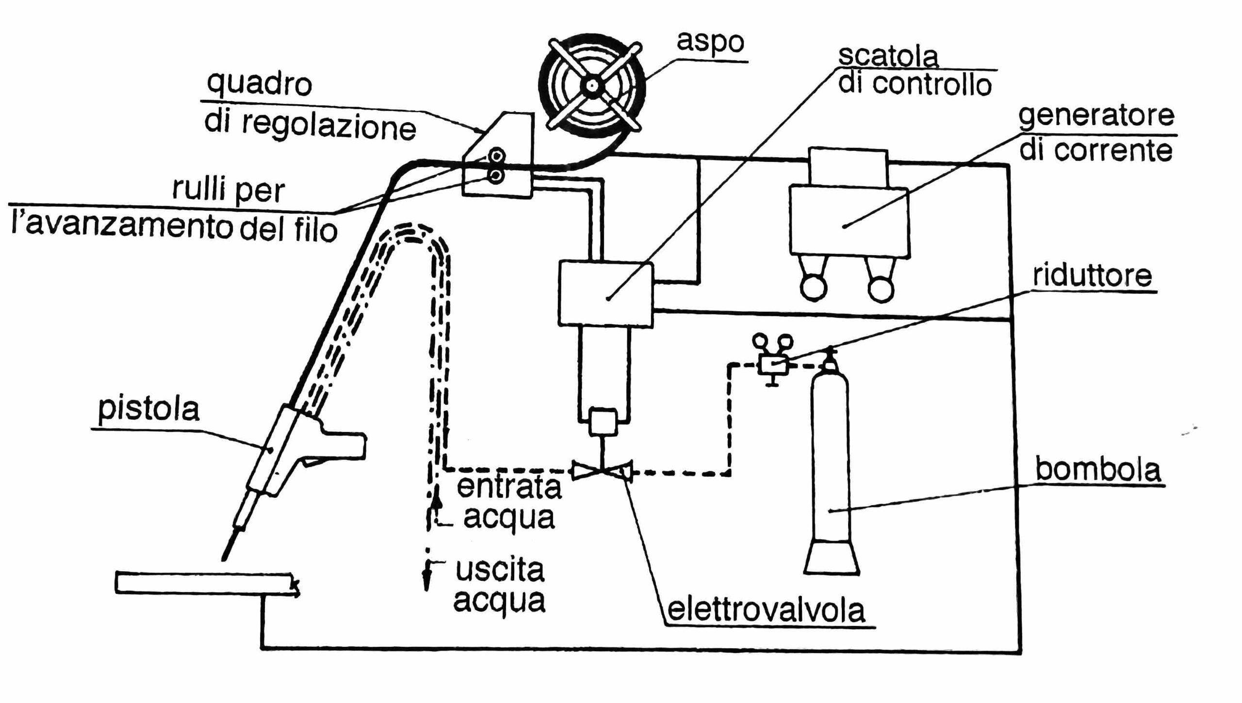 - Unità di regolazione: Permette di regolare i parametri di saldatura come la velocità del filo, l’intensità della corrente e il flusso di gas.